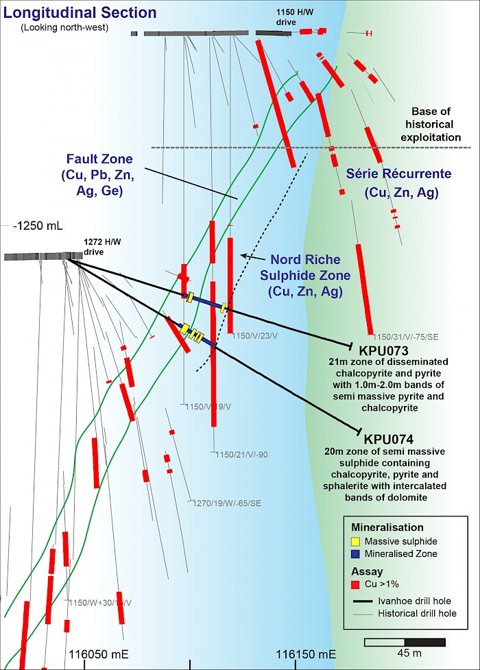 Two holes recently have been drilled into the area where the Série Récurrente zone intersects the Kipushi Fault Zone, historically referred to as the Nord Riche (North Rich) zone. Ivanhoe’s holes KPU073 and KPU074 targeted down-plunge extensions of this zone below the level of historical mining. Zones of disseminated and massive sulphides were intersected in both holes, and assay results are pending.