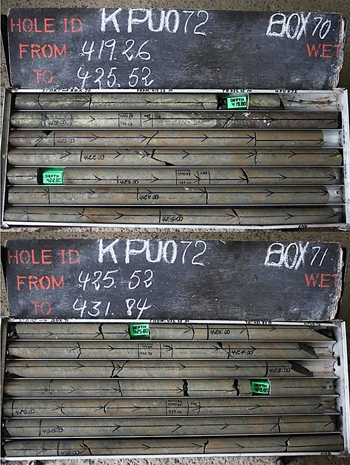 Figure 6: Discovery hole KPU072 with mixed chalcopyrite and sphalerite to 420.55 metres and massive sphalerite from 420.55 to 431.84 metres.