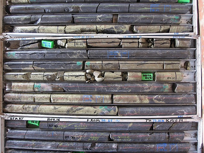 KPU074, drilled at -30 degrees to KPU057, intersected a zone of mixed massive sulphide (chalcopyrite and sphalerite) and dolomite between 73.77 and 94.00 metres with mixed massive sulphide between 73.77 and 77.15 metres, 79.7 and 81.60 metres, 83.00 and 84.17 metres, 84.80 and 86.40 metres and 91.54 to 94.00 metres.