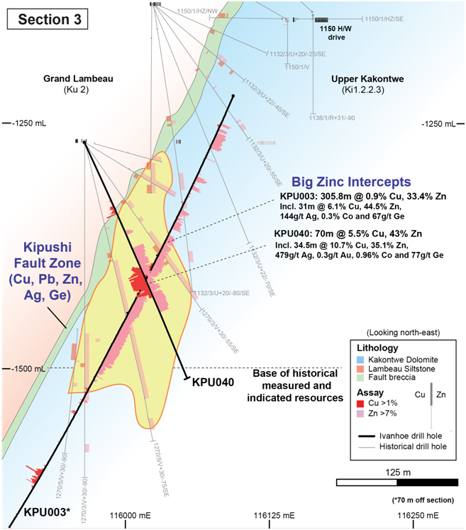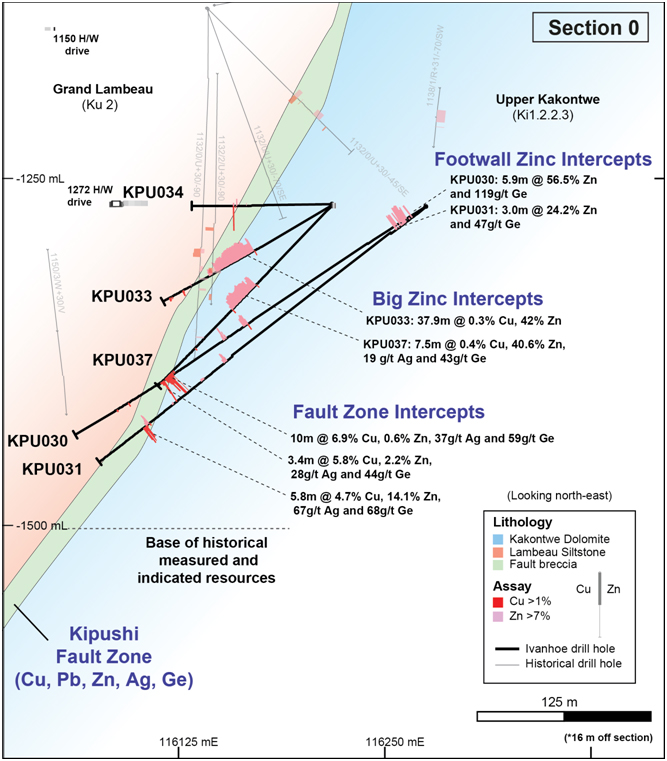 - KPU037 drilled on section line 0: 27.5 metres grading 40.6% zinc, 0.4% copper, 19 g/t silver and 43 g/t germanium.