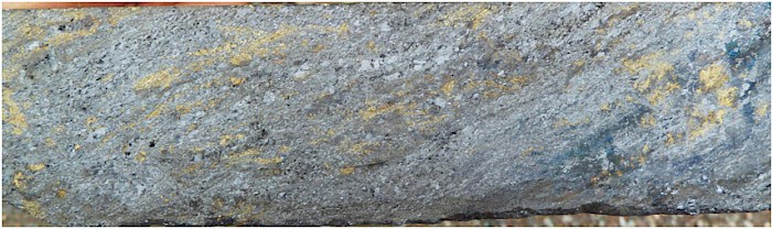 Figure 6: Close-up photographs of massive copper sulphides (chalcopyrite and bornite) with high silver and gold values in drill hole KPU040 through the Big Zinc zone.