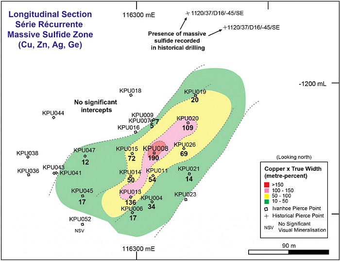 A compilation of Ivanhoe’s drill results to date indicates that the Série Récurrente zone forms a westerly-plunging shoot of high-grade copper-rich massive sulphide that is open up-plunge, and requires more drilling to define its down-plunge extent (Figure 10). Historical drilling by Gécamines intersected this zone up-plunge but it was not mined.