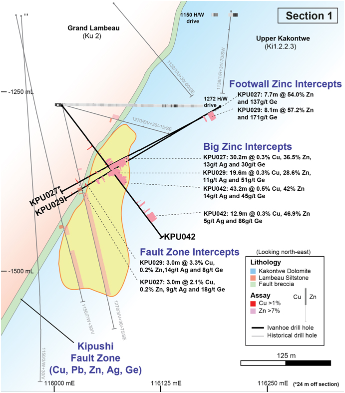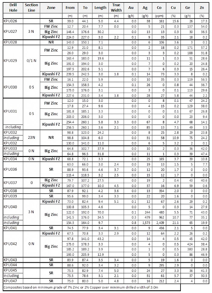 - KPU033 drilled on section line 1: 37.9 metres grading 42.0% zinc, 0.3% copper, 10 g/t silver and 36 g/t germanium.