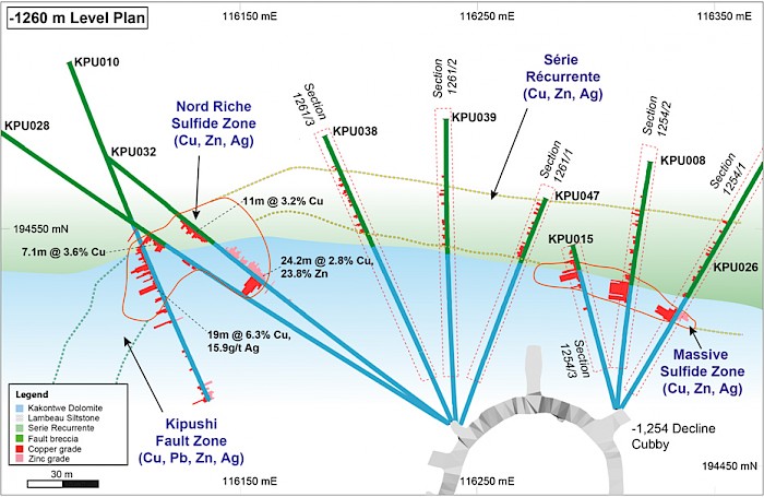 - KPU032 (Nord Riche zone): 24.2 metres grading 2.8% copper, 23.8% zinc and 8.0 g/t silver, including: