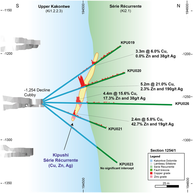 - KPU026 (Série Récurrente zone): 4.4 metres grading 15.6% copper, 17.3 % zinc and 38.0 g/t silver.