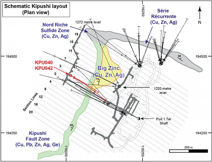 The new results include those from the first hole, KPU040, drilled through the historical Big Zinc zone from the hanging-wall drill drift on the 1,272-metre level, which provides the geometry for near-true-width intercepts. KPU040 was drilled on section 3 North and intersected high grades of base and precious metals mineralization: