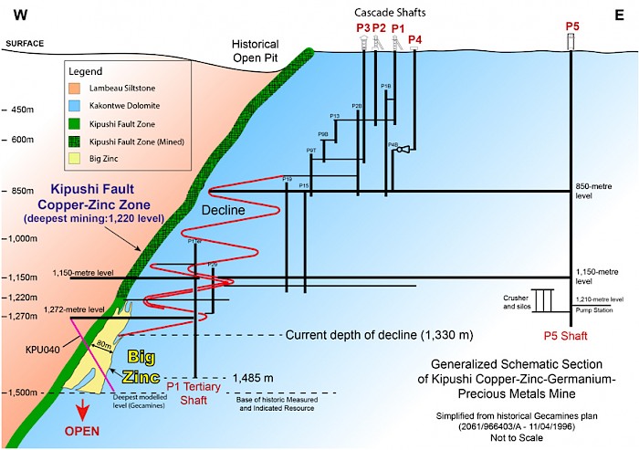 Figure 1: Schematic Kipushi cross-section showing mine infrastructure and the Big Zinc and Kipushi Fault zones.