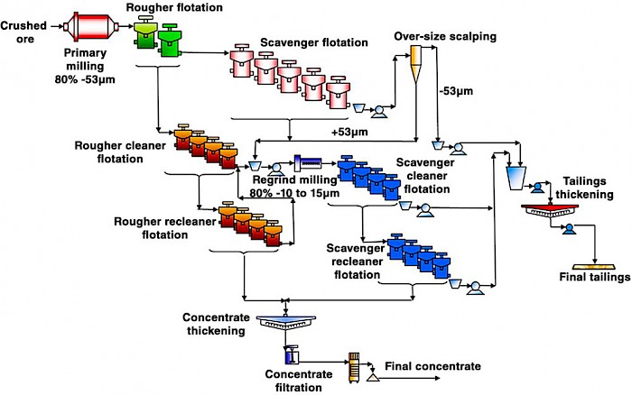The testwork results were achieved using a laboratory flowsheet with a single stage of primary milling followed by rougher and scavenger flotation. The rougher concentrate was cleaned in two stages to produce a high-grade copper concentrate without regrinding. The scavenger concentrate and a screened, coarse portion of the final tailings were combined and reground to between 10 and 15 micrometres (µm), before being cleaned in two stages. The concentrate then was combined with the cleaned, rougher concentrate to form the final concentrate. The flowsheet is a simplification of the previous flowsheet, which included two stages of mainstream grinding and two separate regrind stages.