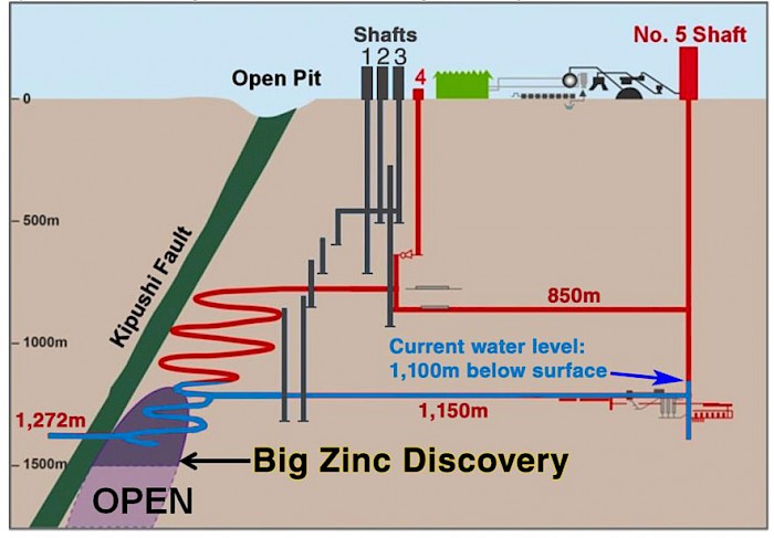 Kipushi cross-section showing current water level and unmined Big Zinc Discovery