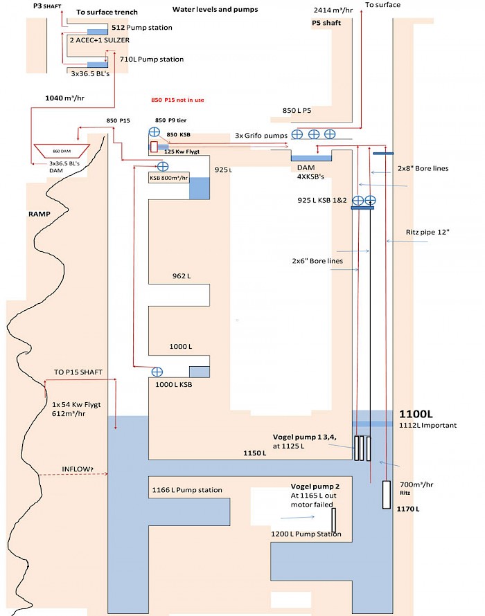 Steelwork and equipment are being progressively replaced and upgraded as the water level drops. New, large-capacity, high-pressure Ritz and Vogel pumps installed in April 2013 now have raised the pumping rate to 64,800 cubic metres per day. Additional capacity is being installed to further increase the pumping rate to a planned 81,600 cubic metres per day.