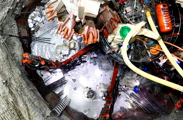 Drilling with a six-boom jumbo drill rig at the bottom of Shaft 1.