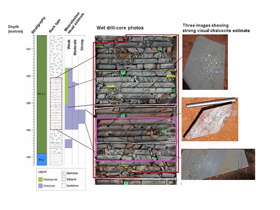 The target area where DD1124 was drilled – now named Kakula West – was selected by the Kamoa-Kakula geological team at the intersection of the axis of the interpreted Kakula trend with a southwesterly-northeasterly-trending antiform (the Kakula West antiform). DD1124 intersected 16.3 metres of visually moderate-strong chalcocite copper mineralization, similar to the mineralization encountered within the core of the chalcocite-rich Kakula Deposit, beginning at a downhole depth of 422.2 metres (410 metres below surface), which included a 4.0-metre zone of strong-to-very-strong mineralization beginning at a downhole depth of 432.4 metres (see Figure 1). Assays for DD1124 are expected in approximately two weeks. Up to five rigs are being mobilized to fast-track the drilling at the Kakula West discovery.