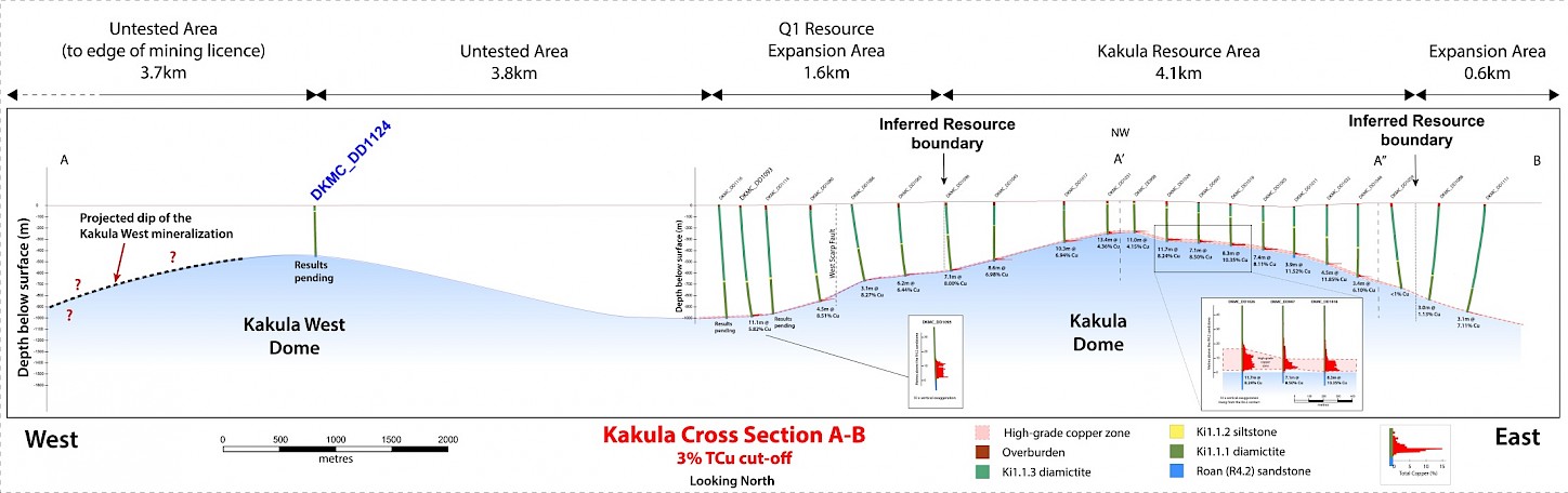 Figure 4. Section along the axis on the Kakula Deposit on the section A – A’- A’’ – B showing drilling completed to date and composites at a 2.5 % copper cut-off.