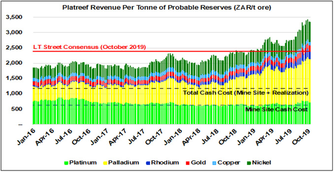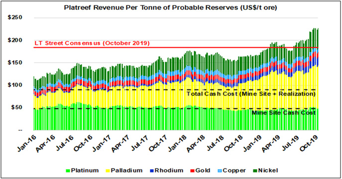 Palladium, nickel and rhodium have been three of the best performing metals in 2019. The platinum-to-palladium ratio at Platreef is approximately 1:1, and Platreef has remarkably high concentrations of nickel and copper. At current prices, palladium and nickel comprise more than 60% of the weighted price of the ‘basket’ of metals in Platreef’s ore. Rhodium and gold also add significant contributions to Platreef’s contained metal valuation.