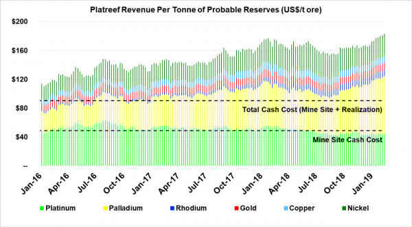 Figure 1. Revenue per tonne of ore at the Platreef Project has risen steadily since 2016 (shown in US dollars).
