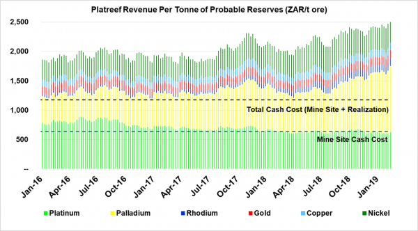 Figure 2. Revenue per tonne of ore at the Platreef Project has risen steadily since 2016 (shown in South African rand).