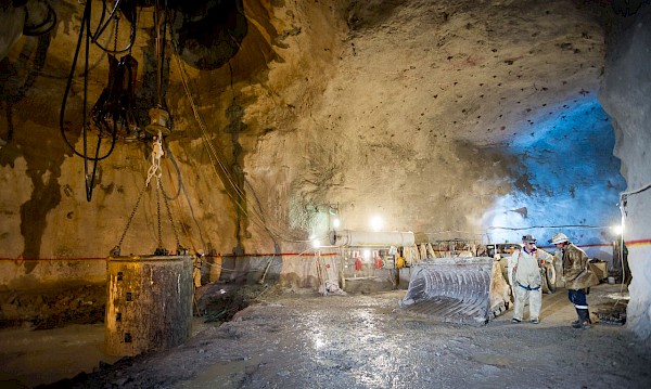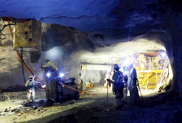The northern excavation at Shaft 1’s 750-metre station, showing the large scale of the underground workings − ideal for safe, mechanized mining.
