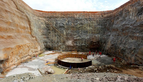 Ongoing construction of the foundation that will support Shaft 2’s 103-metre-tall concrete headframe. Shown below is the 11.5-metre shaft ring set-up for the 10-metre internal diameter shaft.