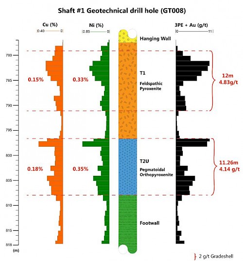 Geotechnical drill hole GT008, drilled vertically below Shaft 1, indicates that the shaft will intersect the upper contact of the Flatreef Deposit (T1 mineralized zone) at an approximate shaft depth of 783 metres. The grade for the T1 mineralized zone at this location is 4.83 grams per tonne (g/t) 3PE (platinum, palladium and rhodium) plus gold, 0.33% nickel and 0.15% copper over a vertical thickness of 12 metres (see downhole plot of drill hole GT008 below).