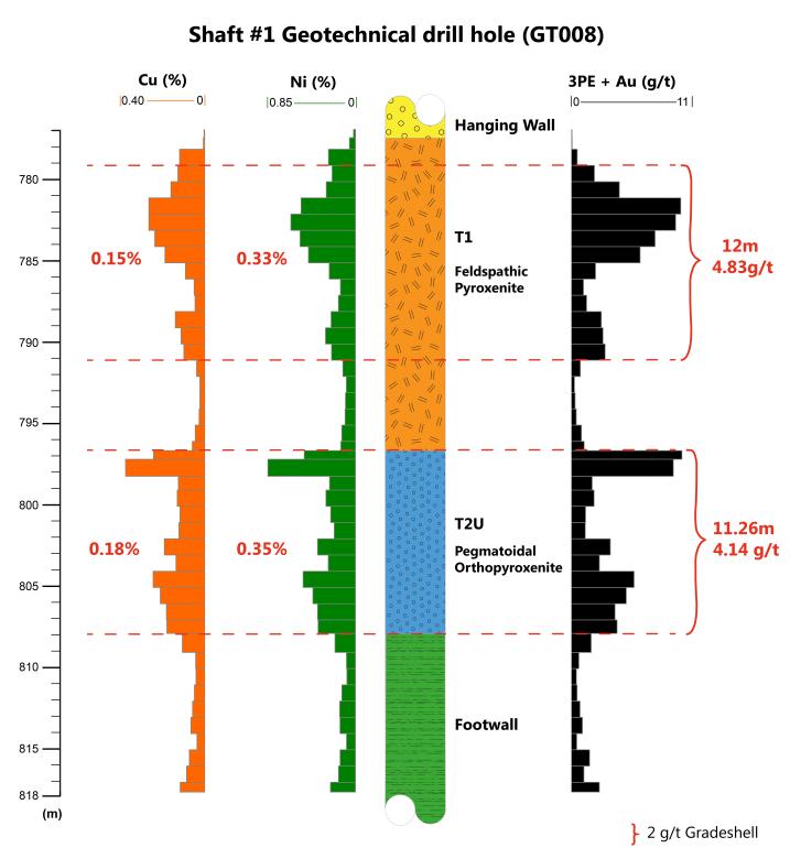 Geotechnical drill hole GT008, drilled vertically below Shaft 1, indicates that the shaft will intersect the upper contact of the Flatreef Deposit (T1 mineralized zone) at an approximate shaft depth of 783 metres. The grade for the T1 mineralized zone at this location is 4.83 grams per tonne (g/t) 3PE (platinum, palladium and rhodium) plus gold, 0.33% nickel and 0.15% copper over a vertical thickness of 12 metres (see downhole plot of drill hole GT008 below).